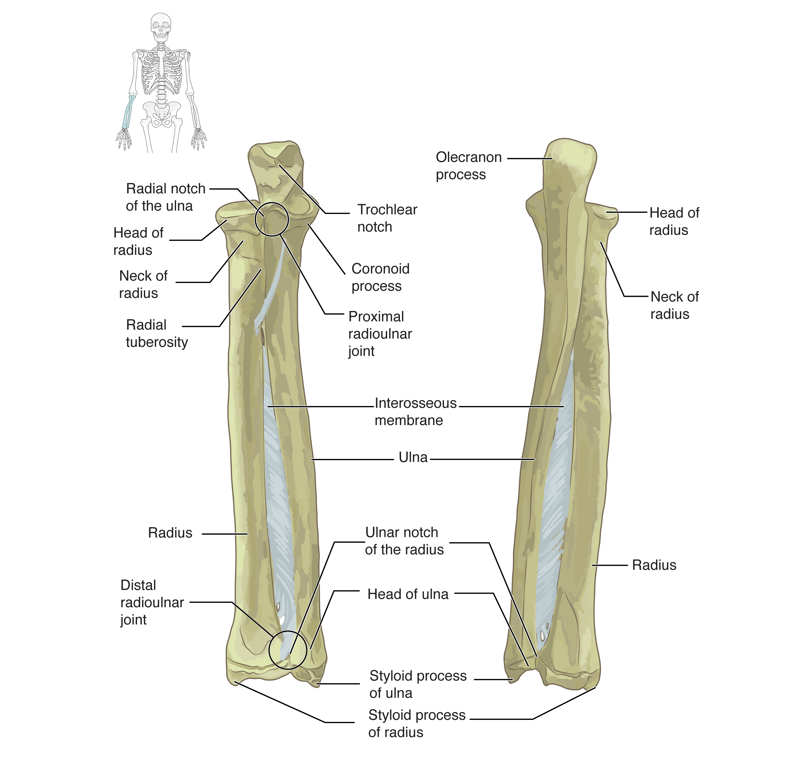The forearm is the region of the upper limb located between the elbow and wrist joints. This region contains two bones, the ulna medially and the radius on the lateral (thumb) side. The elbow joint is formed by the articulation between the trochlea of the humerus and the trochlear notch of the ulna, plus the articulation between the capitulum of the humerus and the head of the radius. The proximal radioulnar joint is the articulation between the head of the radius and the radial notch of the ulna. The proximal ulna also has the olecranon process, forming an expanded posterior region, and the coronoid process and ulnar tuberosity on its anterior aspect. On the proximal radius, the narrowed region below the head is the neck; distal to this is the radial tuberosity. The shaft portions of both the ulna and radius have an interosseous border, whereas the distal ends of each bone have a pointed styloid process. The distal radioulnar joint is found between the head of the ulna and the ulnar notch of the radius. The distal end of the radius articulates with the proximal carpal bones, but the ulna does not.