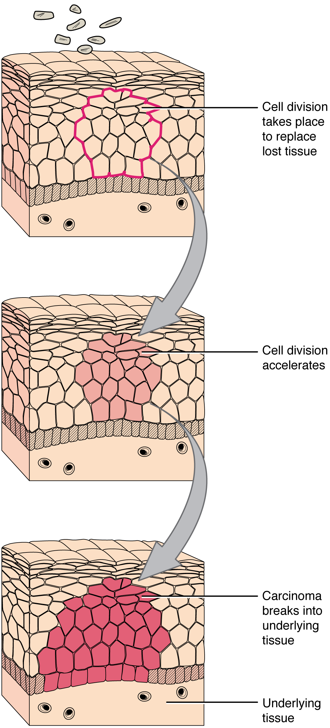 A mutation is defined as a permanent change in the DNA of a cell. Epigenetic modifications, changes that do not affect the code of the DNA but alter how the DNA is decoded, are also known to generate abnormal cells. Alterations in the genetic material may be caused by environmental agents, infectious agents, or errors in the replication of DNA that accumulate with age. Many mutations do not cause any noticeable change in the functions of a cell, however, if the modification affects key proteins that have an impact on the cell’s ability to proliferate in an orderly fashion, the cell starts to divide abnormally. As changes in cells accumulate, they lose their ability to form regular tissues. A tumor, a mass of cells displaying abnormal architecture, forms in the tissue. Many tumors are benign, meaning they do not metastasize nor cause disease. A tumor becomes malignant, or cancerous, when it breaches the confines of its tissue, promotes angiogenesis, attracts the growth of capillaries, and metastasizes to other organs (Figure 4.6.2 Development of Cancer). The specific names of cancers reflect the tissue of origin. Cancers derived from epithelial cells are referred to as carcinomas. Cancer in myeloid tissue or blood cells form myelomas. Leukemias are cancers of white blood cells, whereas sarcomas derive from connective tissue. Cells in tumors differ both in structure and function. Some cells, called cancer stem cells, appear to be a subtype of cell responsible for uncontrolled growth. Recent research shows that contrary to what was previously assumed, tumors are not disorganized masses of cells, but have their own structures.